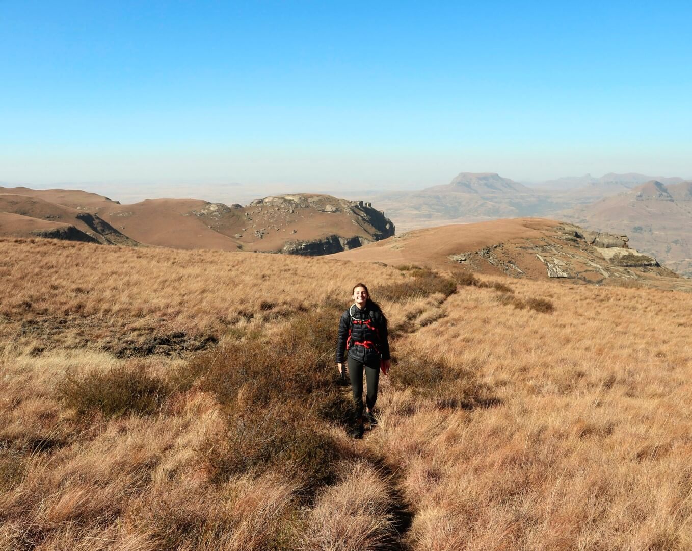 Follow this path as it winds its way along the top of the ridge, right past the Gudu stream catchment area until the Plowmanskop Ridge is reached, which is easily located and a positive way of not losing the route. This ridge has magnificent views of the Diamond, the Castle Rocks and the entire Royal Natal Park area. At this point, turn right (southeast) and follow the sketchy path which winds its way across the grassy slopes, down a gentle slope towards the end of Plowmanskop. Nearing the end of this gentle slope, it eases to the right and down into the valley to the Falls lip.